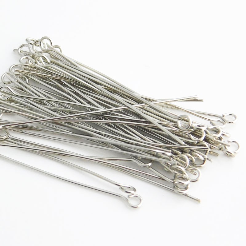 Pack of 50 silver tone eyepins, some may be bent but are easily straightened with a pair of pliers. Ideal for a variety of jewellery making projects.