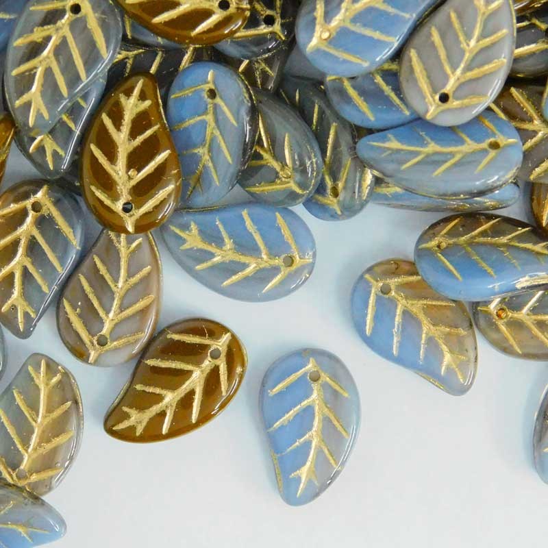 These pretty mixed shades of blue and brown Czech pressed leaves have the same pressed pattern on both sides, highlighted in a gold colour, and have a single hole from front to back.