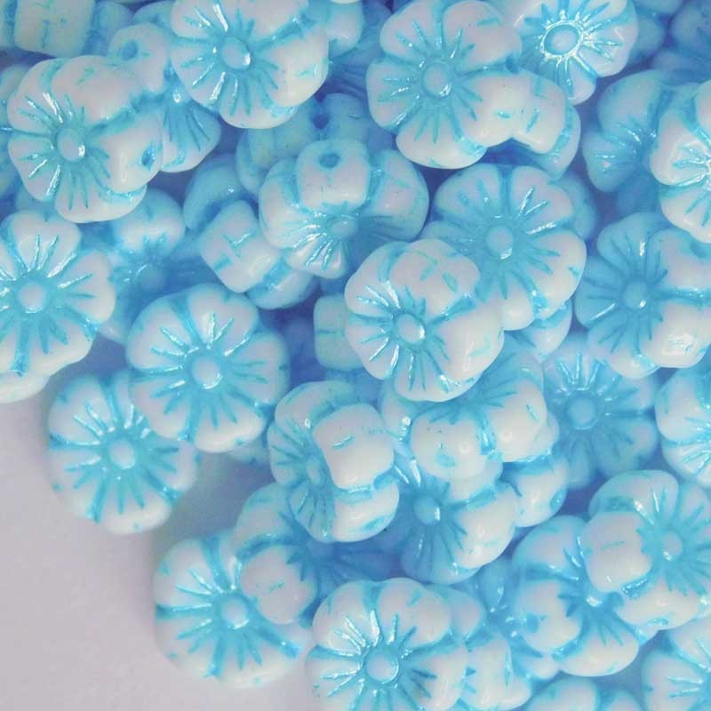 These pretty Czech pressed glass flower beads have a chalk white base with metallic light blue highlights. They have the same design on both sides and have a single hole.